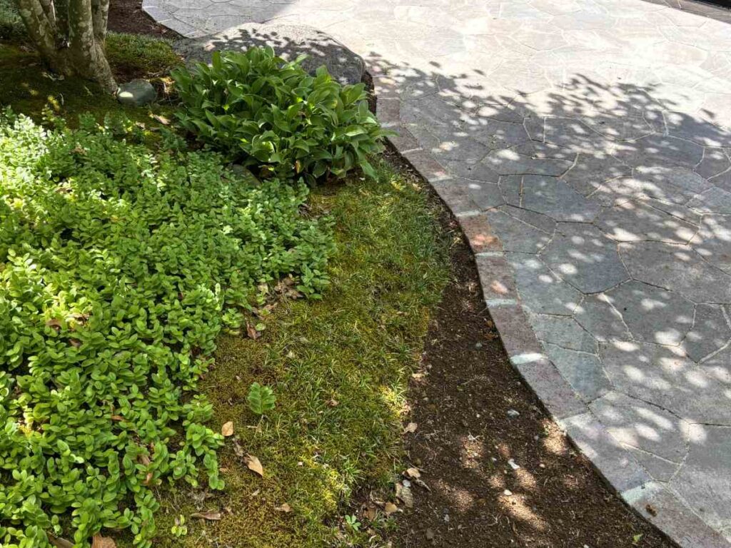 芝を全て撤去してハードな舗装空間に置き換える選択もありますが、今回は「自然の風合い」を残したいというお客様のご希望を優先。そこで、芝の部分を「ユニソン ティーナ」に置き換え、その周囲には既存の庭木・苔を活かす設計としました。これにより、芝刈り・雑草・苔除去の手間が激減。毎年のメンテナンスコスト・時間・作業頻度を大幅に削減することに成功しました。