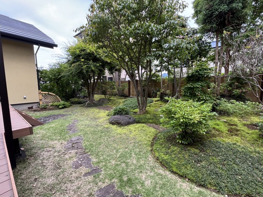 広々とした芝生のお庭。もともとは苔と芝のコントラストが魅力のある「庭」でしたが、時間とともに芝の中に苔が侵入し、「芝のお手入れが大変」「苔を取り除くのが負担」というお悩みを抱えておられました。